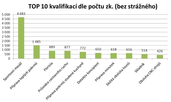 TOP 10 kvalifikací pro ČR (bez strážného – u této kvalifikace bylo provedeno 89 tisíc zkoušek kvůli zákonné povinnosti pro všechny, kteří na této pozici pracují bez osvědčení)